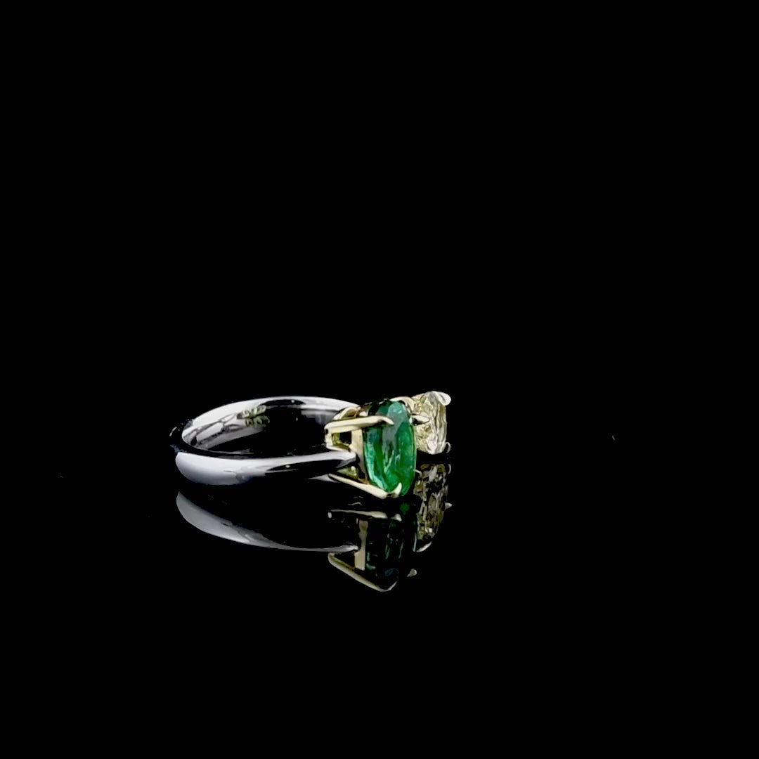Bu yüzük 1,20 karat damla kesim sarı pırlanta ve 1,56 karat oval kesim zümrüt taşla tasarlanır çünkü taşların uyumu göz alıcı bir parlaklık sağlar. Damla pırlanta ışığı yoğun şekilde yansıtır ayrıca oval zümrüt zarif bir dokunuş sunar. Böylece Zümrüt ve Sarı Pırlanta Altın Yüzük eşsiz görünür.