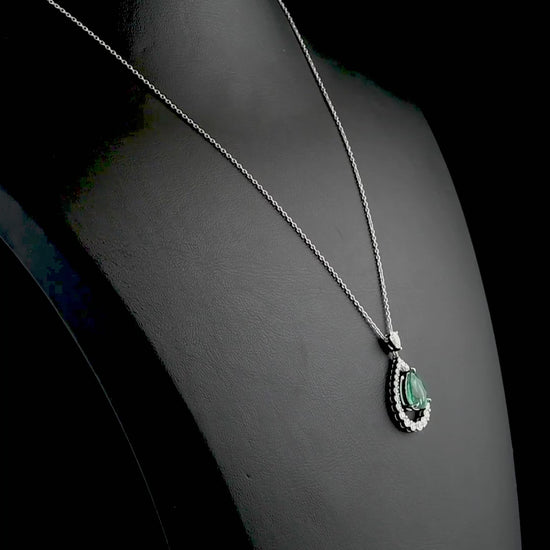 Damla kesim 2,24 karat zümrüt taşı, etrafını saran 0,74 karat yuvarlak kesim pırlanta ve 0,25 karat damla kesim pırlanta ile birleşerek göz kamaştırıcı bir zümrüt kolye oluşturur. Beyaz altınla tasarlanan bu pırlantalı zümrüt kolye, zarif görünümüyle günlük kullanımda şıklık sunar çünkü özel günlerde de lüks bir stil tamamlayıcısıdır. Ayrıca modern tasarımı sayesinde her yaşa hitap eden şık bir seçenek olur.